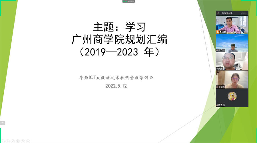 为鼓励促进各部门与广大教职工,尤其是青年教师,积极融入广州商学院发展,并提高学校教职工队伍的整体教学、科研、管理能力,产出高水平的教学、科研成果,提升学校的学术水平和影响力,推动学校硕士学位授予单位和学科建设工作,结合学校实际,2022年5月12日16:00-17:30,华为信息与网络技术学院大数据技术教研室在腾讯会议开展全体学习座谈会。本次座谈会由大数据技术教研室主任卢鹏主持,大数据技术教研室专任教师全体参与此次座谈会,共计6人。