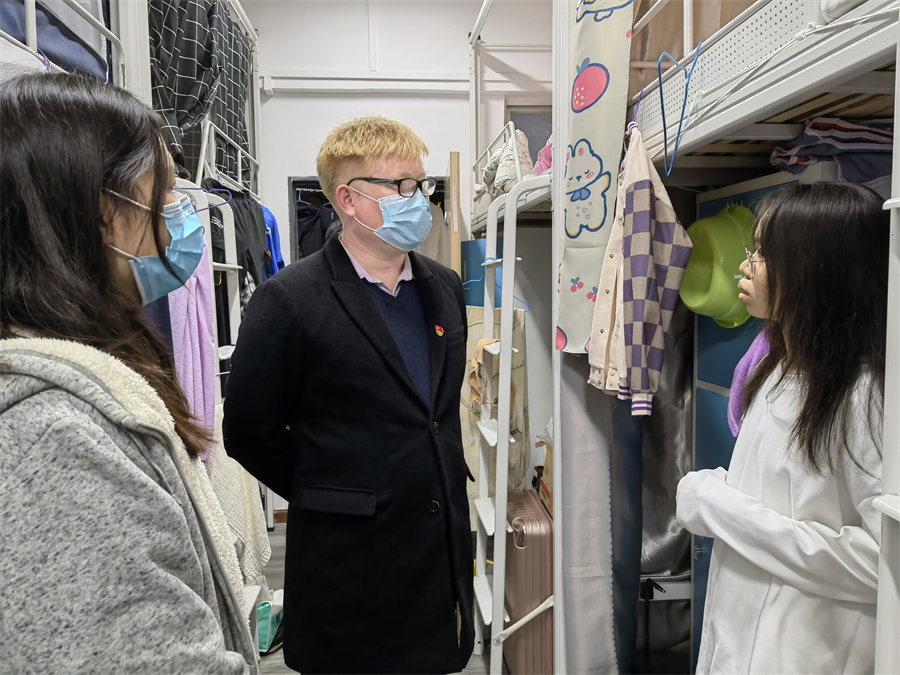 在辅导员的陪同下,关树基来到学生宿舍进行走访,向学生们表达了诚挚的问候,祝愿大家冬至快乐。在走访过程中,学院领导和老师对在校的学生致以诚挚的关怀以及问候。他们详细地了解同学们考试前复习的情况,并询问同学们的生活所需,及时解决学生的困难。提醒学生提防网络诈骗和各种常规骗术。同时,关心新生们的身体健康情况,叮嘱学生要注意宿舍卫生,做好疫情防控、预防冬季传染病、多开窗通风、及时清理宿舍垃圾,并叮嘱学生要按时休息,科学作息。