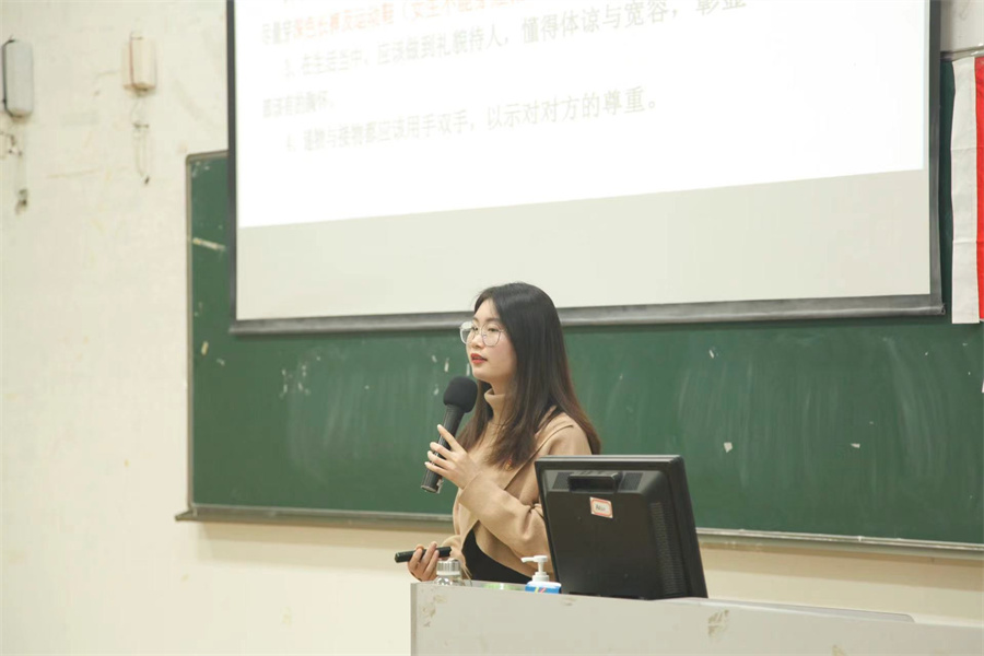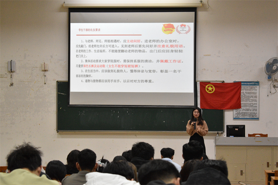 许丽琴以“寻常处见功力,细微处见真章”为题,从领导、辅导员及办公室介绍、文书培训目的及意义、文书格式及各类文体撰写方式以及学生干部素质培训四个方面进行讲解。重点从文书格式及文体入手,强调通讯稿、计划书、策划书、工作总结的主要撰写方法和要求。课上,她展示了书写的模板,以举例子方式强化干部们的印象。除了文书知识外,她还注重干部的素质培养的引导,认为干部应具备模范意识、服务意识、问题意识、方法意识四个意识。在工作、服务的过程中处理好服务同学和锻炼自我、学习与工作、“学生干部”与“普通同学”双重身份、自我培养中德与才的关系等。最后,她还提醒在场的学生干部进一步坚定理想信念,加强业务、能力、心理、集体素质的锻炼。