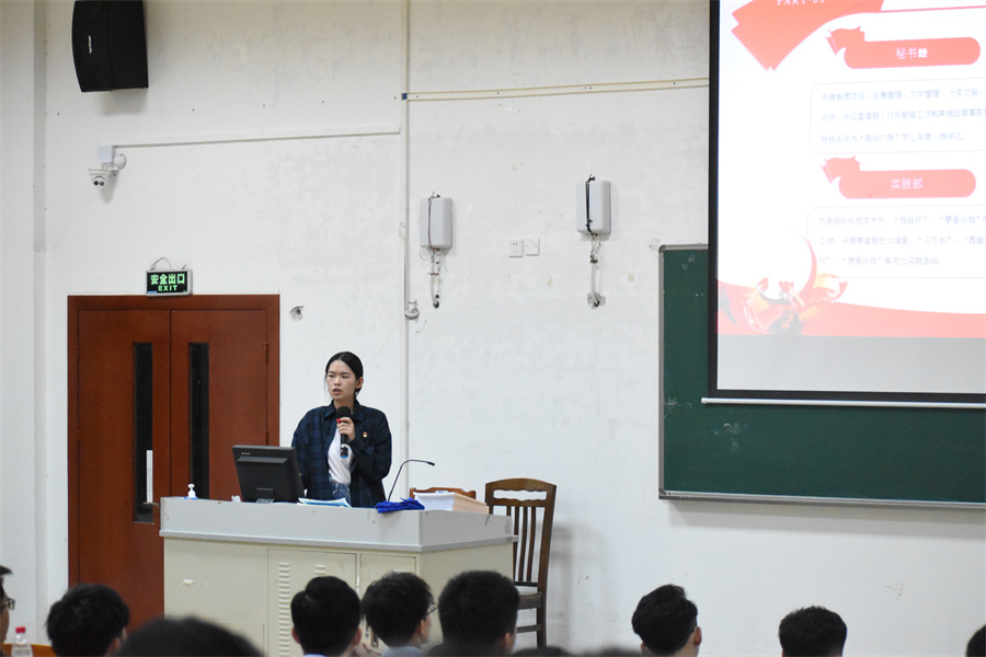 司徒洛琳以学生干部的工作职责为基点,对华为信息与网络技术学院团委、学生会职能、基层团支部、班委会工作职责做了详细的介绍,力求让到场的各位团学干部及基层班团干部了解自身工作内容以及所对接职能部门的工作性质,从而使干部更加清晰自身定位。她还通过思维导图的方式展示了校院班三级是如何进行联动,指出校院班三级组织从“学校——学院——班级”是相互联系、相互配合的关系。司徒洛琳还着重强调班团干部作为学院学生中的骨干,是密切联系群众的重要桥梁纽带。通过提出问题“学生干部怎么做”引发思考,从而引申作为一名学生干部应该具有怎么样的表现,着重提及“管理者”和“执行者”身份在作为学生干部中应该起到的作用和效果。她还表示学生干部对待工作需要做到:清楚工作定位,用清晰的头脑工作,及时做到查漏补缺、各施其职和相互补位。