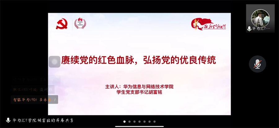 为进一步提高入党积极分子对红色血脉和党的优良传统的认识,端正入党积极分子的品格和作风。4月29日晚,华为信息与网络技术学院党总支在腾讯会议开展线上2021-2022学年度第二期分党校学院培训班第四讲,本次党课采用线上授课的方式开展,由华为信息与网络技术学院学生党支部书记胡富铭主讲,学生党支部党员、分党校培训班学员共计46人全程参与此次课程。