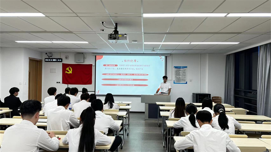 为有效推动党风党纪教育落实到位,深入贯彻开展党纪学习教育,引导党员真正把纪律规矩转化为思想自觉、政治自觉、行动自觉。122cc太阳集成游戏学生第二党支部于6月18日在第九教学楼310课室开展以“恪守六大纪律,筑牢思想根基”为题的党纪学习教育。党支部书记胡富铭、组织委员司徒洛琳、宣传委员林海燕及全体党员参加会议。本次会议由胡富铭主持。