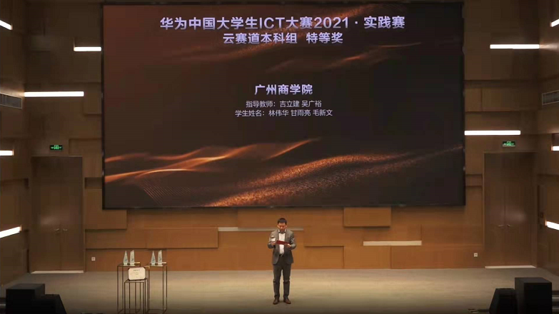 12月25日晚,华为中国大学生ICT大赛2021全国总结赛获奖名单新鲜出炉。我校华为信息与网络技术学院(华为ICT学院)毛新文、林伟华、甘雨亮再战告捷,在31个赛区118支队伍中脱颖而出,荣获华为中国大学生ICT大赛2021实践赛云赛道本科组特等奖,位居全国本科组云赛道第一名,赢得进军2022年5月全球总决赛的入场劵,将于2022年5月代表中国角逐全球总决赛冠军。