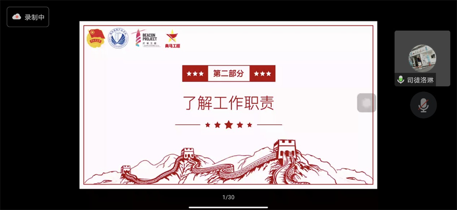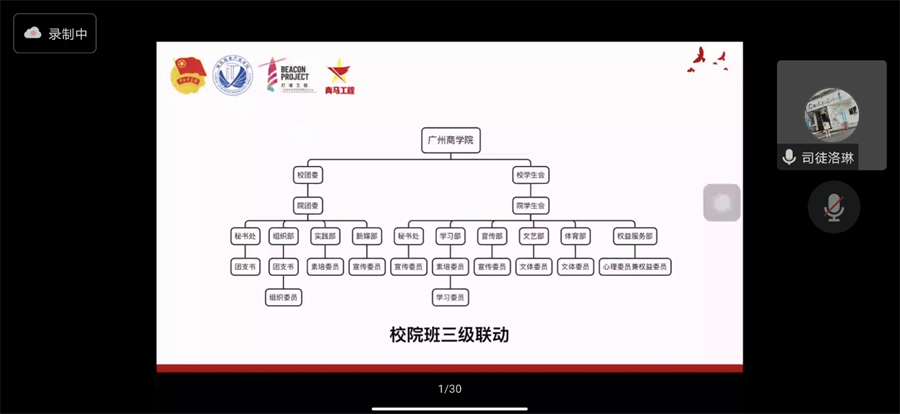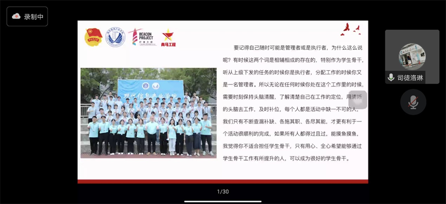 司徒洛琳以学生骨干的工作职责为核心,对现代信息产业学员团委、学生会和基层班团骨干工作职能尽心进行详细的介绍,结合校院班三级联动思维导图,指出“学校——学院——班级”是相互联系、相互配合的关系,促使各位学员充分认识自身工作职责及部门工作属性,从而清晰自身定位,立足岗位职责,扎实推进工作,努力提升自身工作能力素质。