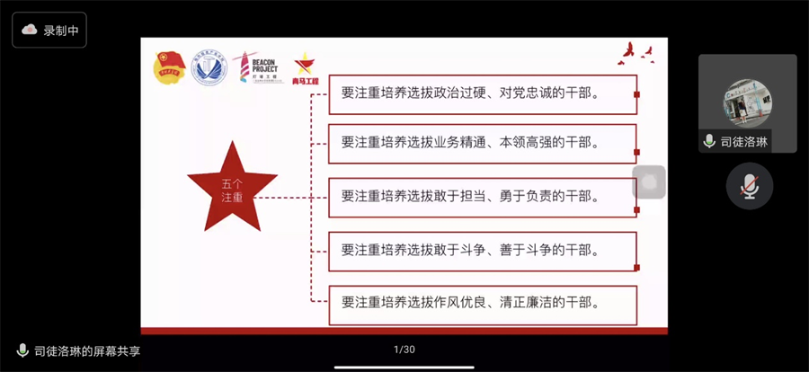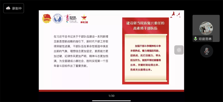 司徒洛琳以“全心投入,用心服务——做堪当民族复兴重任的高素质干部队伍”为授课主题,从党的二十大报告解读、了解工作职责以及如何建设高质量骨干队伍三个方面为学员进行授课,引导学生建设政治过硬、适应新时代要求、具备领导现代化建设能力的干部队伍。