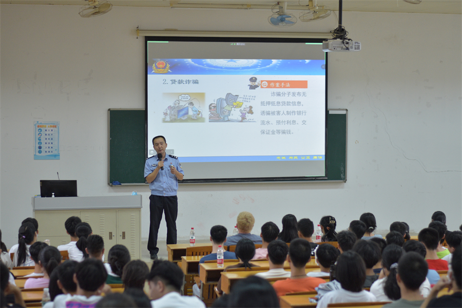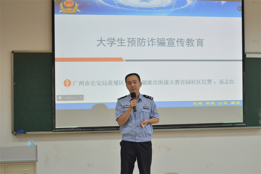 为进一步提升学生预防诈骗能力,增强安全防范意识,切实保障广大师生利益,筑牢校园安全线。9月20日下午,122cc太阳集成游戏组织2022级本科新生开展大学生预防诈骗宣传教育讲座。广州市黄埔区龙湖街派出所警官范志红受邀出席,为2022级本科新生带来了一场生动的预防诈骗宣传教育讲座。党总支书记关树基、2022级全体辅导员和2022级全体本科新生参加讲座。
