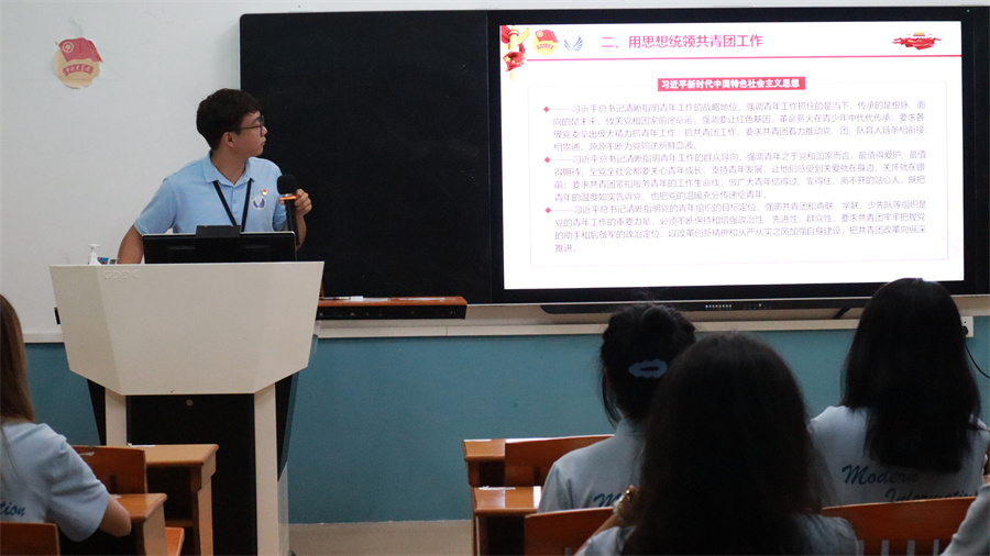 会议伊始,林华景分别从“在革命性磨砺进的中国共青团”、“用习近平新时代中国特色社会主义思想统领共青团工作”、“新时代中国青年的使命担当”三方面进行领学。