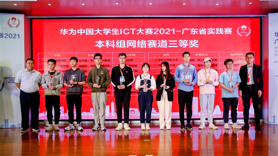 11月13-14日,华为中国大学生ICT大赛2021实践赛广东省决赛圆满结束,我校四支参赛队伍在比赛中喜获佳绩,分别获本科云赛道一等奖和三等奖,本科网络赛道2个三等奖的优异成绩,获奖数量和等级位居广东省本科赛道第一名。其中获一等奖学生团队将于12月中旬代表广东省参加全国总决赛。