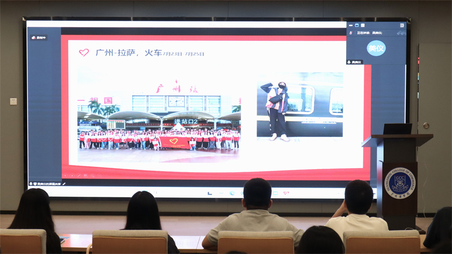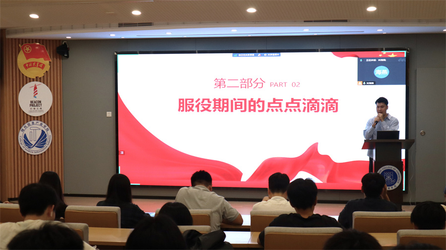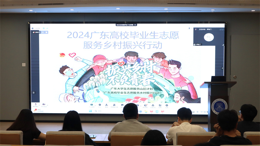接着,通过线上方式,罗驰丁以广东大学生志愿服务山区计划为出发点,分享了他在山区计划的工作、生活、学习日常,并对山区计划的报名政策进行解读,号召同学们积极提升自我,勇于投身到基层工作中,用自身的专业知识建设家乡。