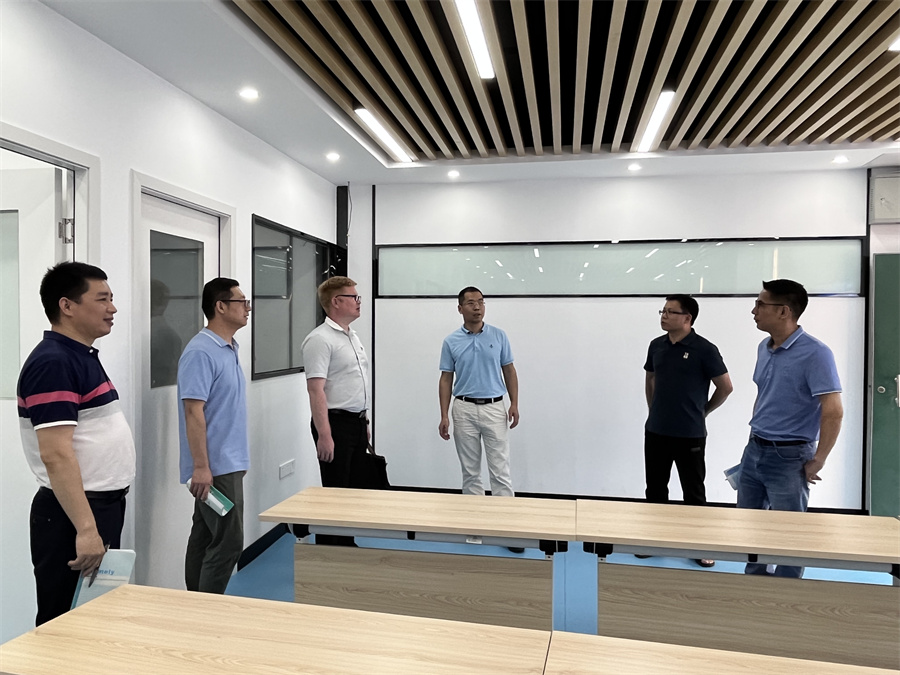 我校一行在城建信息工程学院领导班子的热情接待下参观了该院所在教学办公大楼、VR虚拟现实技术实训室、跨境电商直播间和校企合作教学平台等综合实训场地。曹春华、汤锋在陪同我校一行参观的同时详细介绍了各功能实训室的设置、建设标准、主要功能和实训方向。我校一行还在现场观摩了校企合作订单班的特色场地和授课模式。