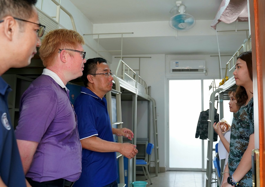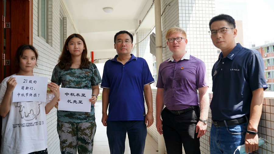 今夜月明人尽望,不知秋思落谁家。为让留校军训学生在中秋节能感到家的温暖,9月19日下午,华为ICT学院执行院长张志峰,副院长李绍强,学院党总支书记、副院长关树基,辅导员许丽琴、司徒洛琳、蔡柳渊和胡富铭为同学们送去了节日最真挚的问候和月饼,为军训新生送去温暖与祝福。