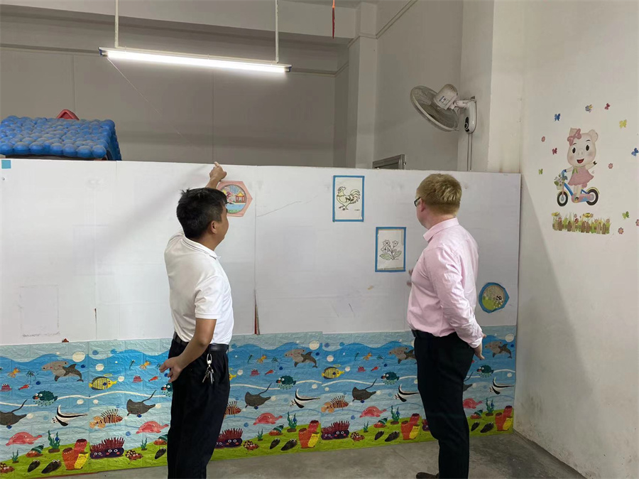 我校一行还在李巽安和刘志昌的陪同下参观了福新小学教学场地、住宿环境、厨房等校内场所和村委会。参观期间,关树基针对福新小学原有损坏墙绘的部分提出修补增色意见,并在现场提出本次下乡绘制新式墙绘方案的建议。我校一行还在李巽安的陪同下参观了福新村的稻虾养殖基地。